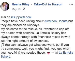 Reena IS continuing this journey and posting all about it on “Take Out Tucson”; a large small business effort (8,000 strong) via a Facebook Group. Expect her drool-worthy photos and recommendations filled with genuine love for hospitality-workers.